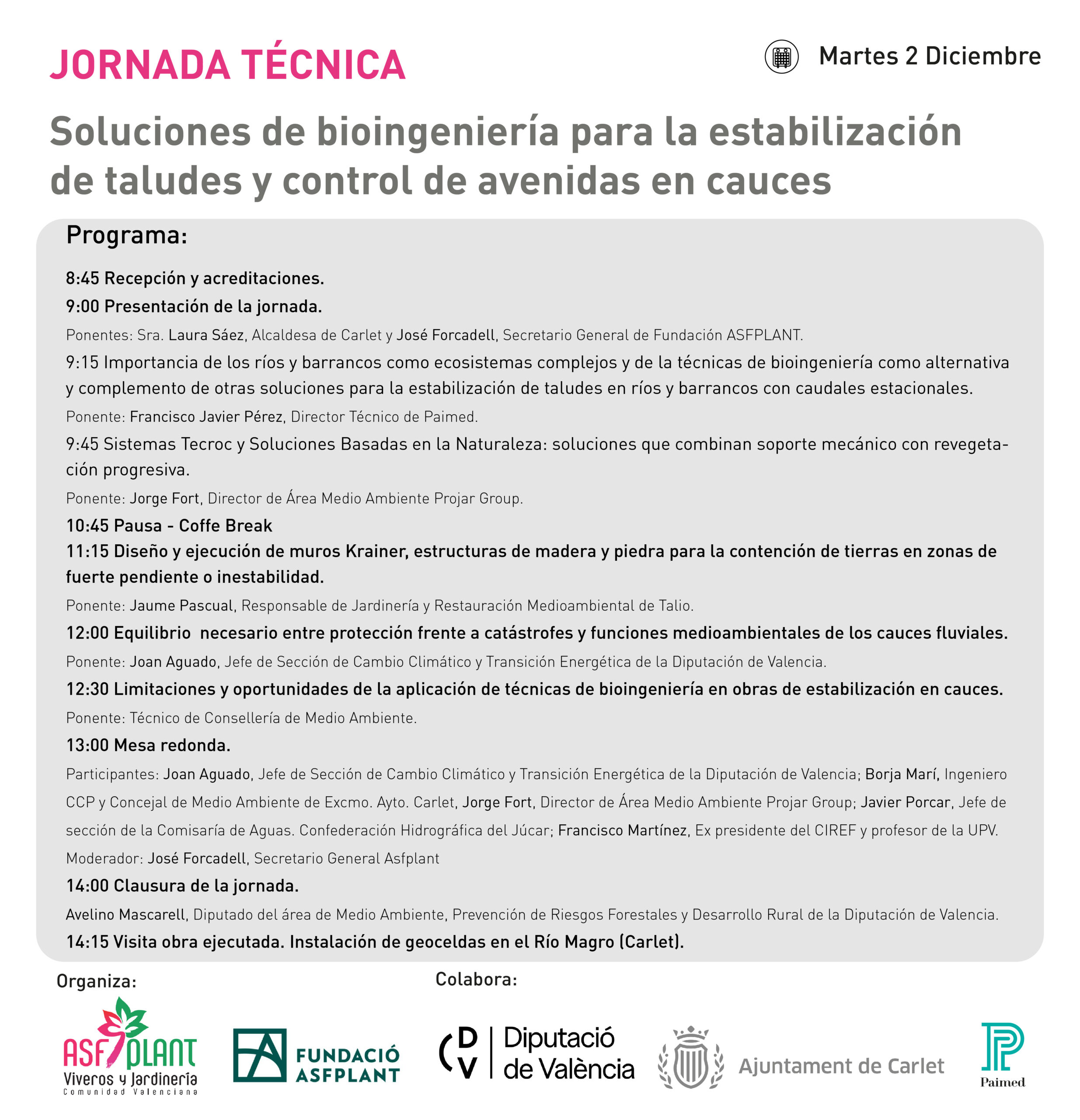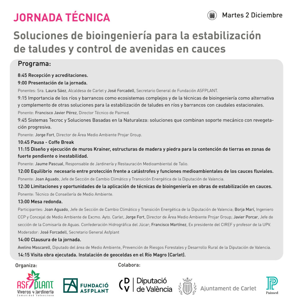 El próximo martes 2 de diciembre, el Salón Giner de Carlet (Valencia) acogerá una nueva Jornada Técnica organizada por ASFPLANT y la Fundación Asfplant, con la colaboración de la Diputación de Valencia, el Ajuntament de Carlet y la empresa Paimed. El encuentro reunirá a expertos en gestión medioambiental, ingeniería y administración pública para abordar los retos y las oportunidades que ofrece la bioingeniería como herramienta sostenible para la protección de cauces fluviales y la estabilización de taludes.